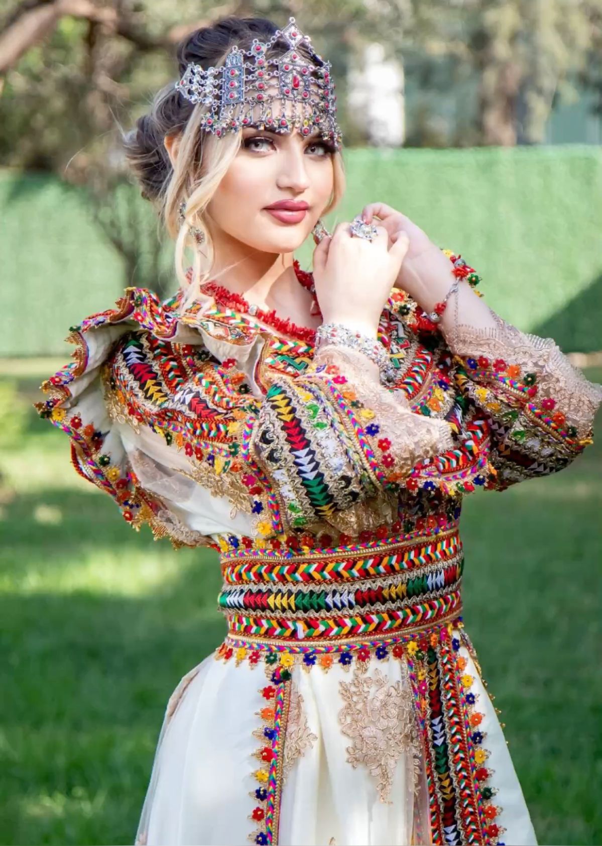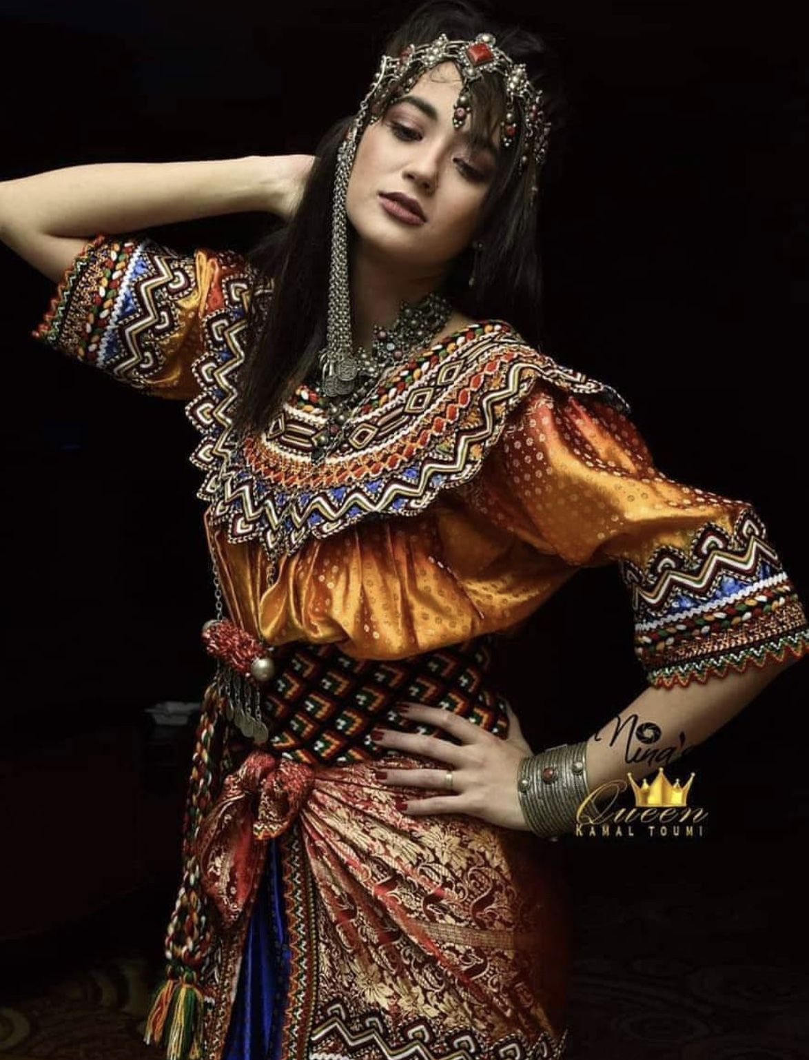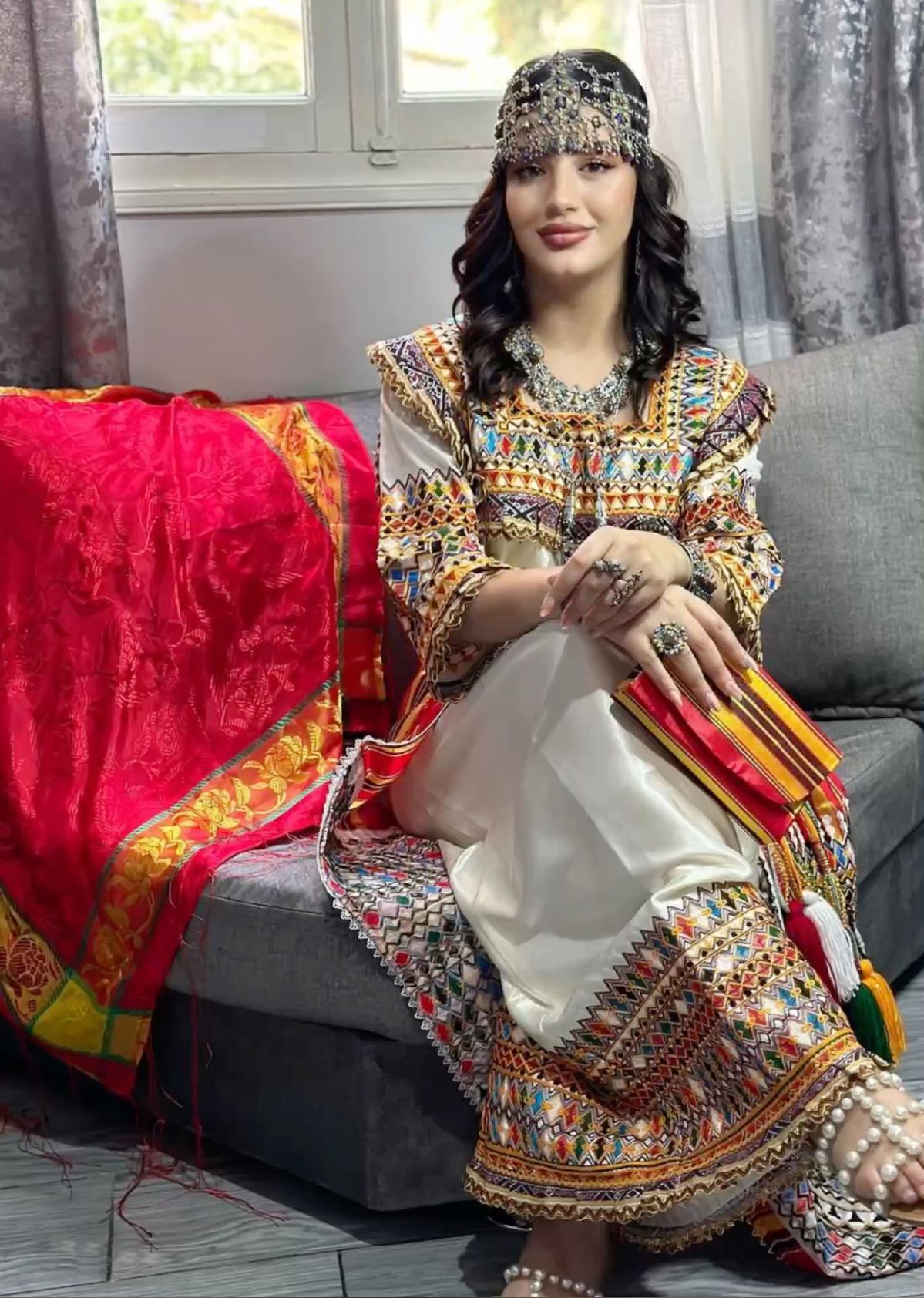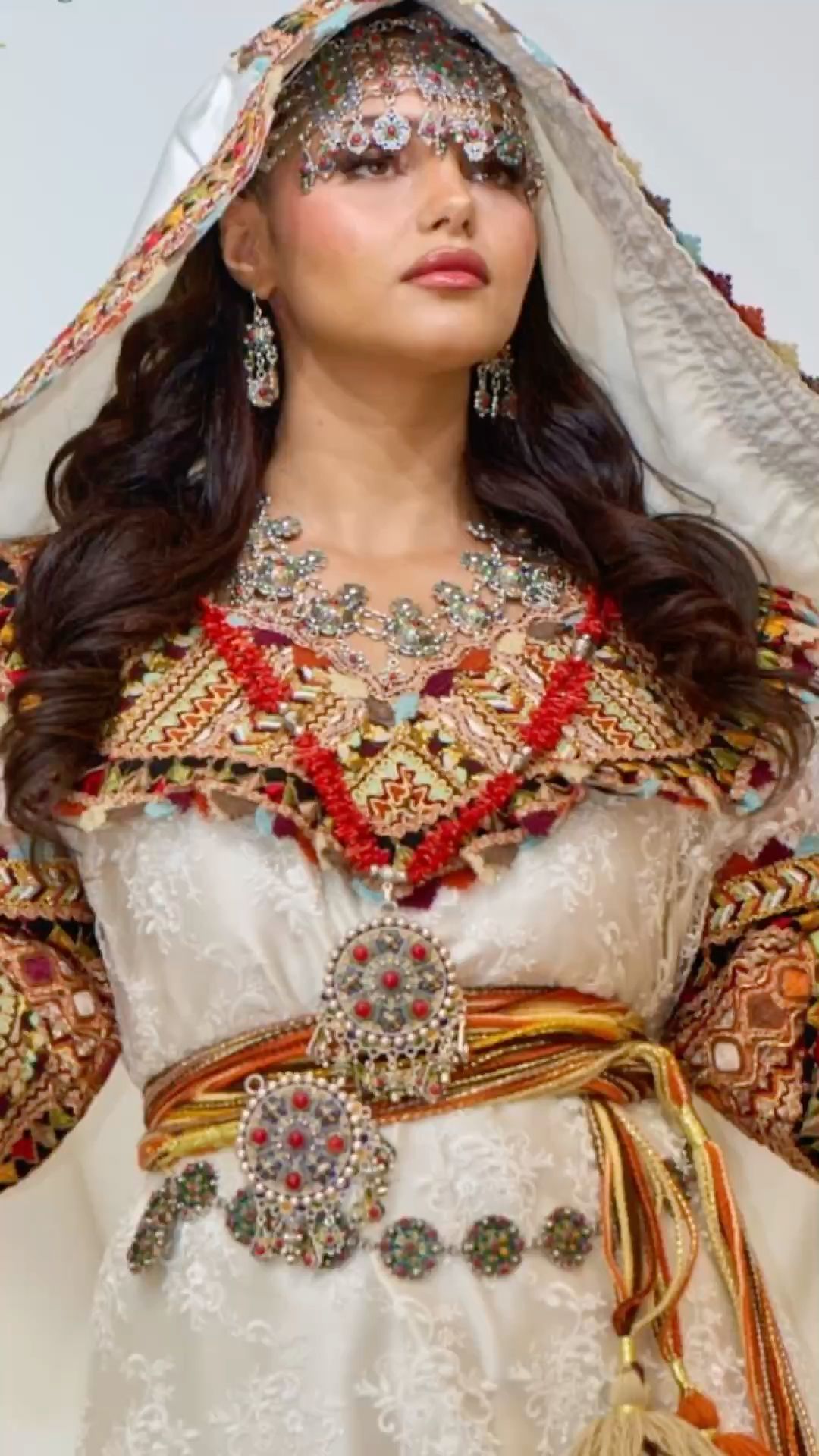 - Bijoux kabyles en argent massif : (généralement filigrané et décoré de corail) et perles, complètent l’ensemble. Colliers (azrar, thazarth), boucles d’oreilles (timenguchtin), bracelets multiples, etc., font partie intégrante de l’attirail traditionnel. Bien que non décrite en détail ici, la parure sert à souligner la richesse et l’histoire ancestrale du costume.