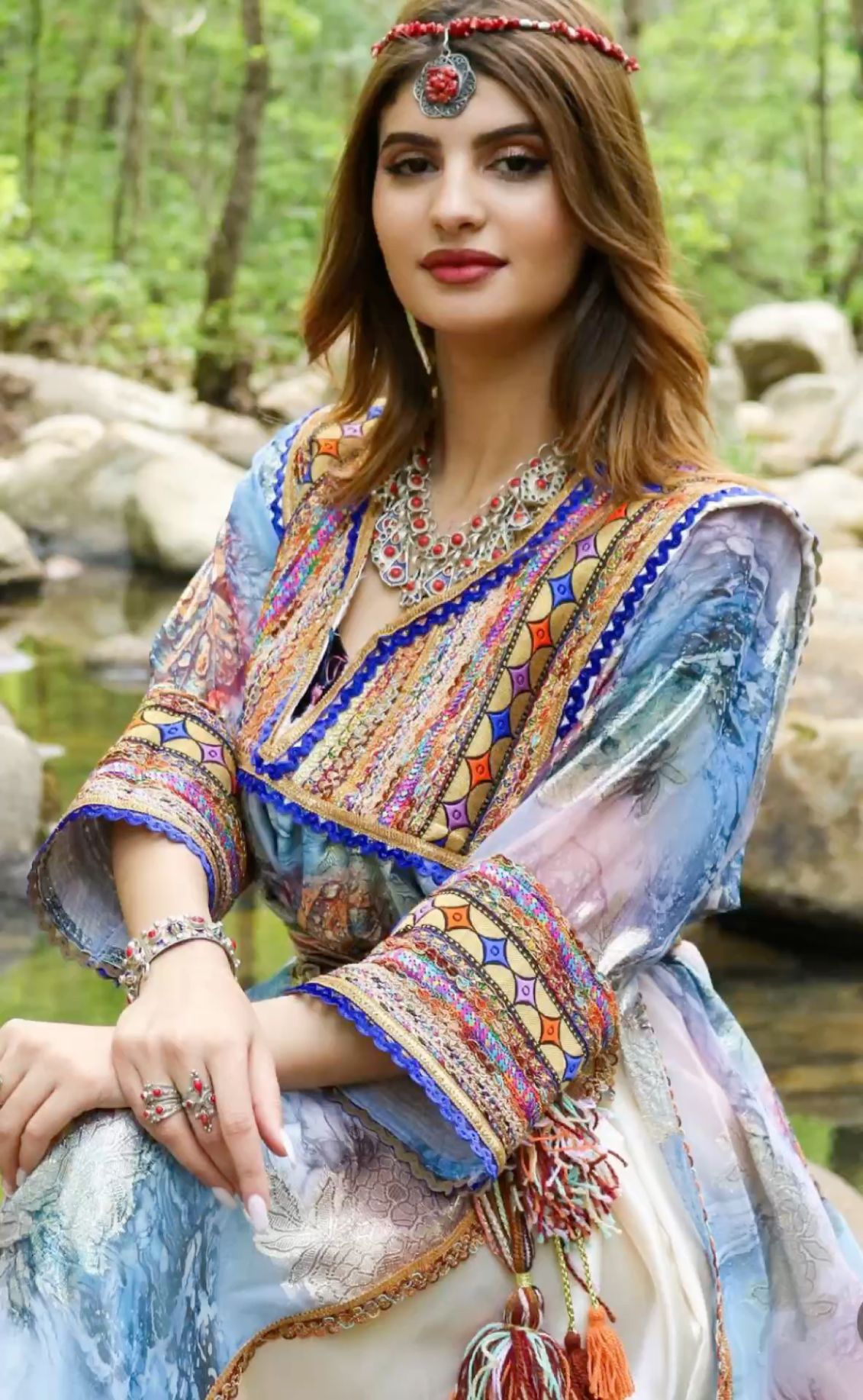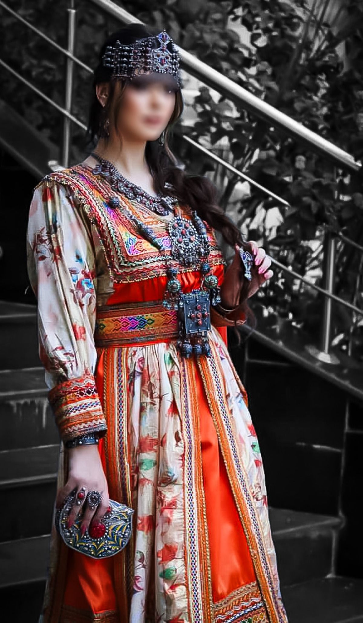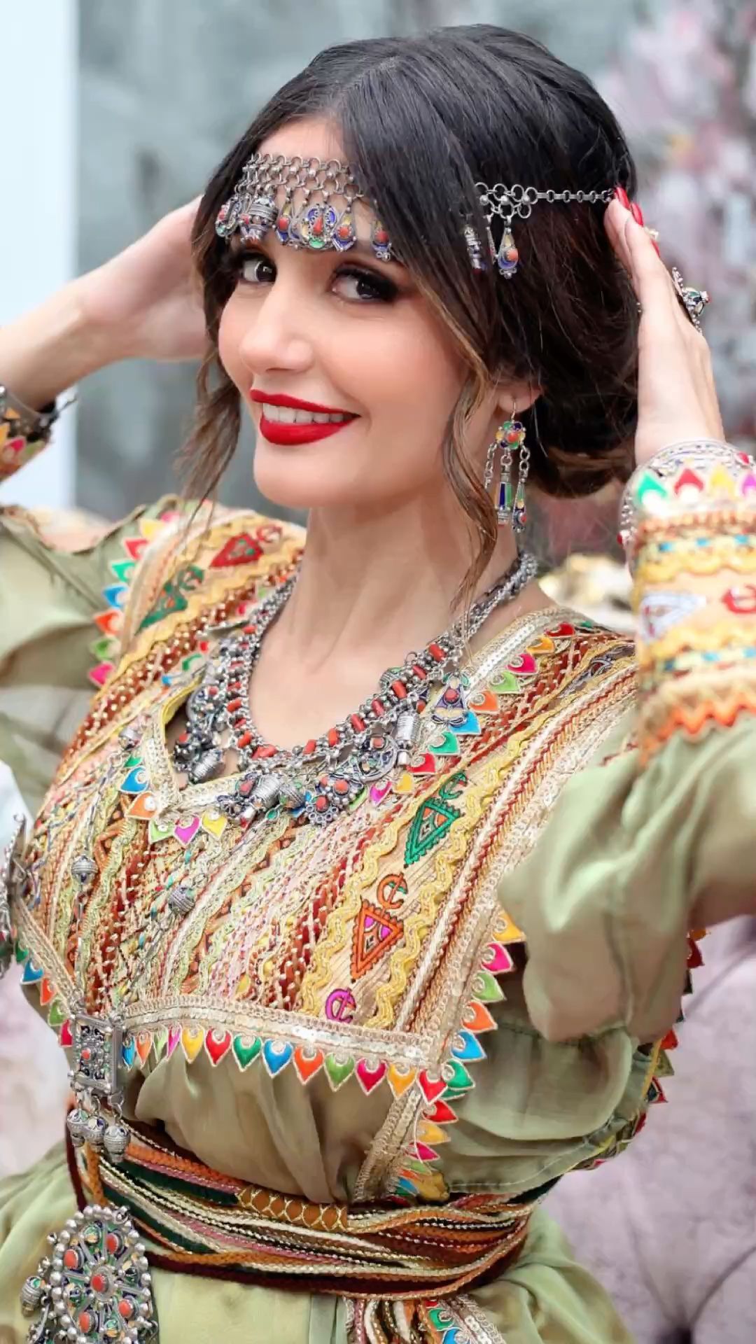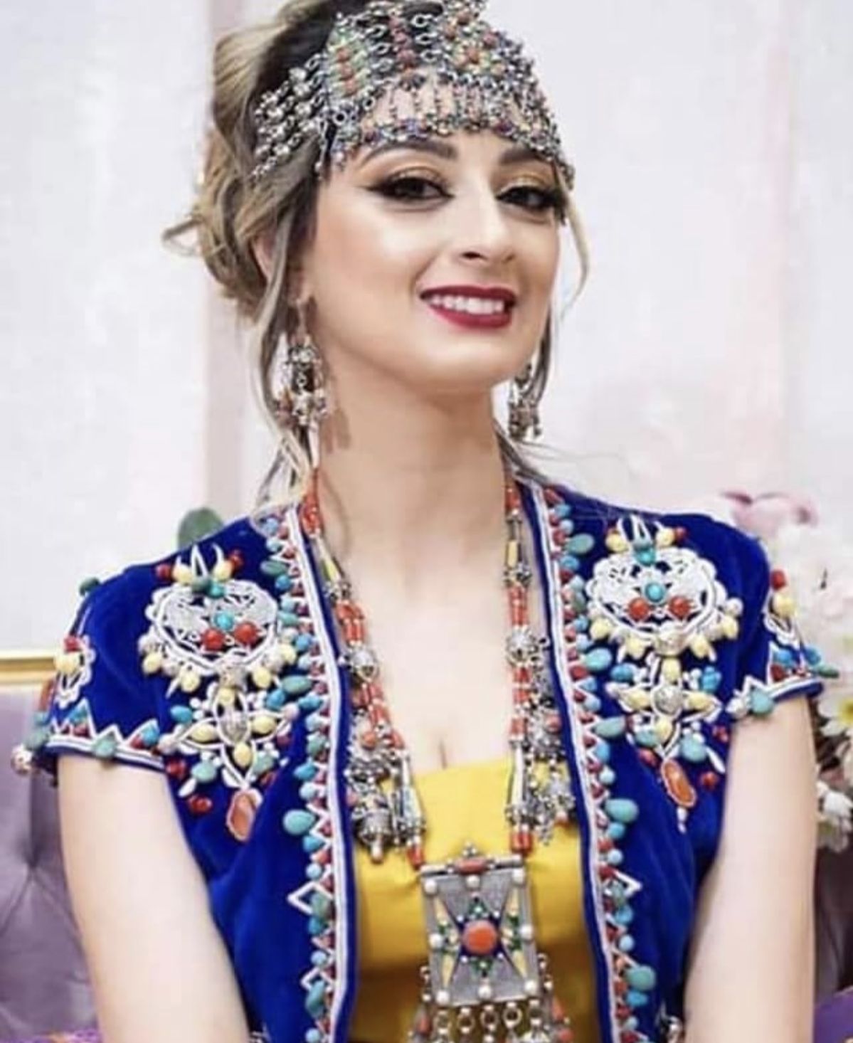 - Bijoux kabyles en argent massif : (généralement filigrané et décoré de corail) et perles, complètent l’ensemble. Colliers (azrar, thazarth), boucles d’oreilles (timenguchtin), bracelets multiples, etc., font partie intégrante de l’attirail traditionnel. Bien que non décrite en détail ici, la parure sert à souligner la richesse et l’histoire ancestrale du costume.