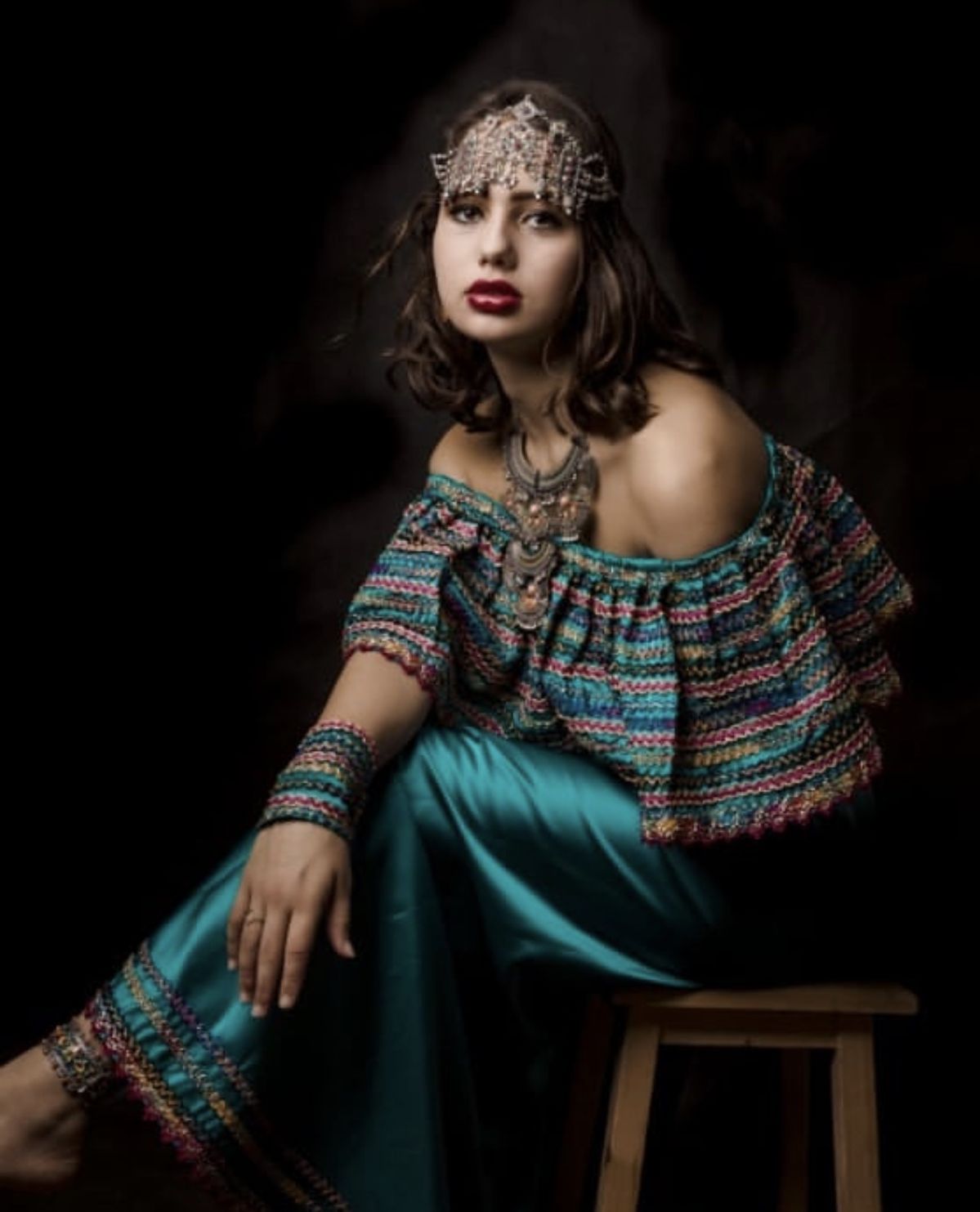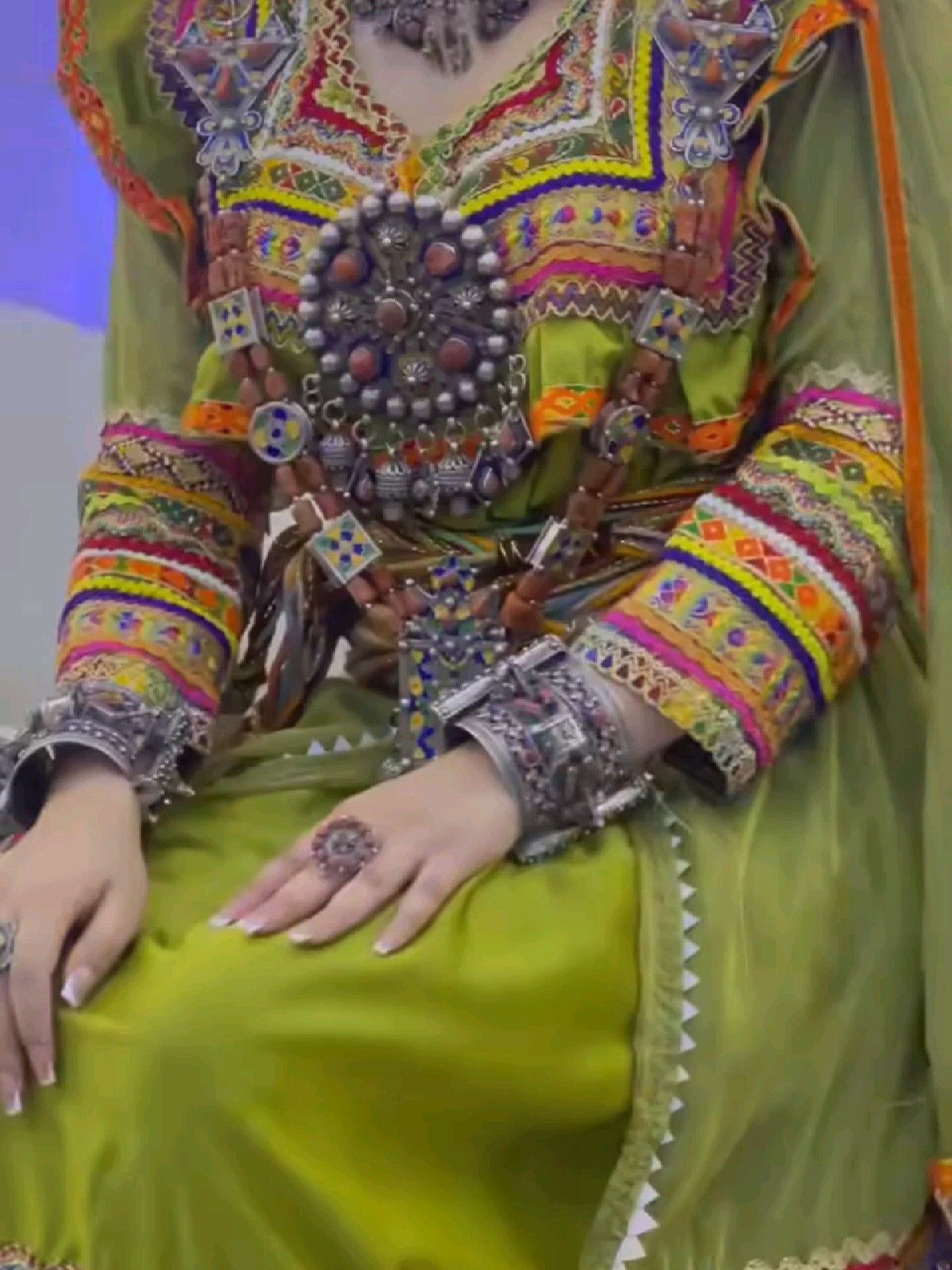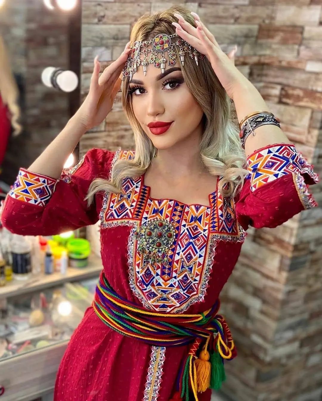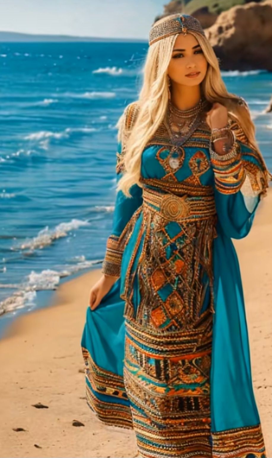 - Bijoux kabyles en argent massif : (généralement filigrané et décoré de corail) et perles, complètent l’ensemble. Colliers (azrar, thazarth), boucles d’oreilles (timenguchtin), bracelets multiples, etc., font partie intégrante de l’attirail traditionnel. Bien que non décrite en détail ici, la parure sert à souligner la richesse et l’histoire ancestrale du costume.