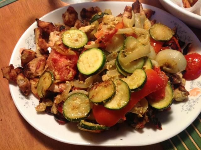 Brochettes de poulet et legumes marinés dans l’ huile d’olive + citron