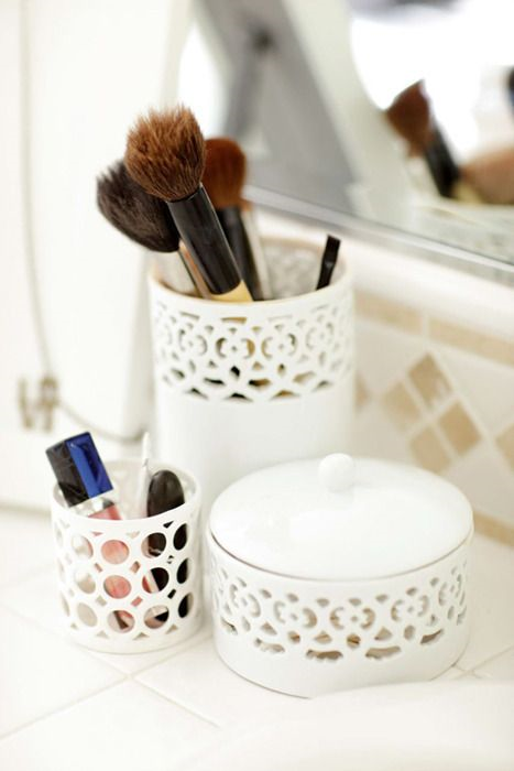 Coucou les filles, Sinfoura, j’ai pas de coin à proporement parler mais comme toi je range mes pinceaux dans un verre, j’ai mis du gros sel en fond pour qu’ils tiennent en attendant de mettre autre chose de plus sympa. Je projette de m’acheter des pots de ce genre: